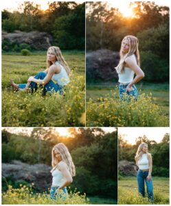 High school senior in a flower field at golden hour, surrounded by vibrant blooms.