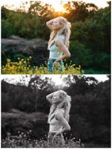 Black and white and color version of the same photo of a senior girl standing in a field of flowers for her senior photography session