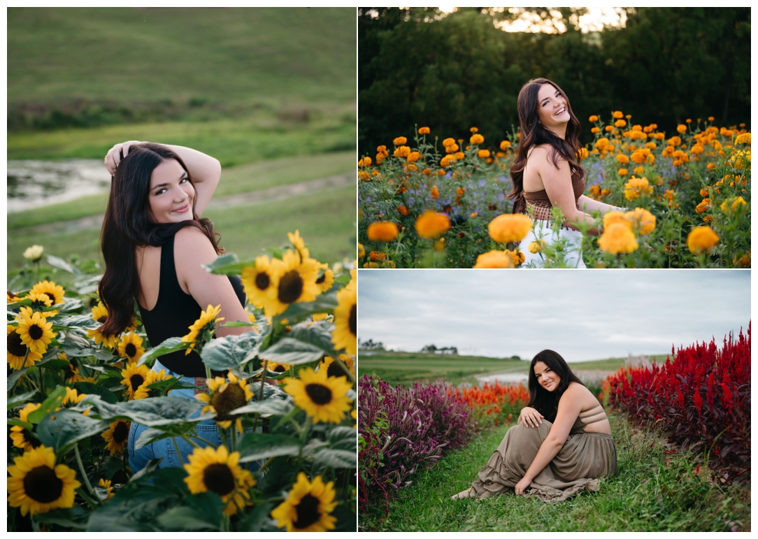 Girl in flower fields with sunflowers surrounding her for her senior photos