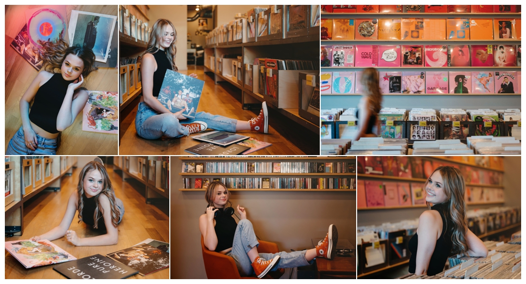 A collage of images of a senior girl hanging out at a record store in Pittsburgh
