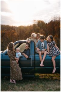 A family of seven stands outside in front of their old pick up truck on their farm for a photo shoot outside of Pittsburgh