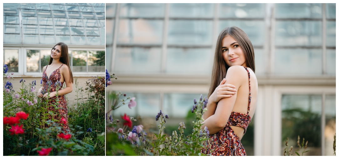 Graduating high school, senior poses in front of a greenhouse and a paisley dress and surrounded by flowers