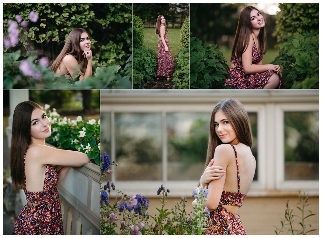 Girl in floral autumn color dress poses in green surrounding leaves for her high school, senior photography session