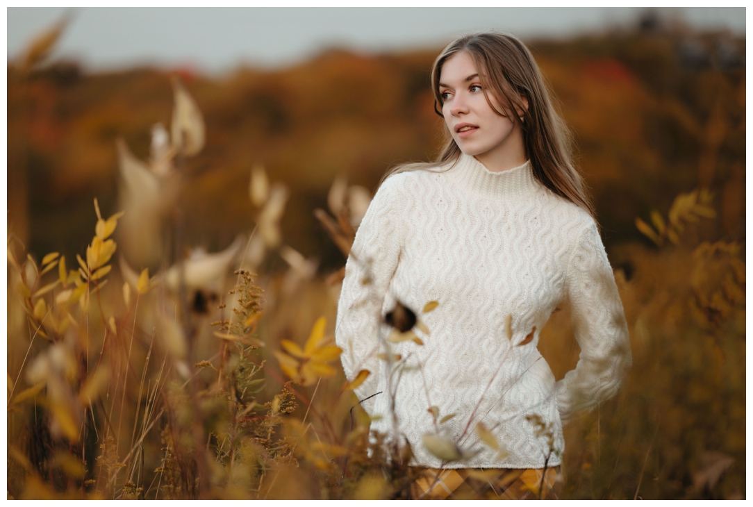 Senior Girl in an off-white sweater poses in a field of fall foliage colors at fern Hollow for the photographer