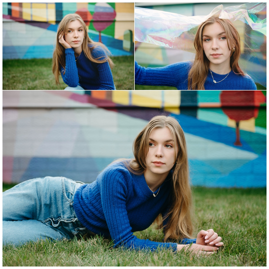 Girl in blue jeans and a blue sweater poses in front of a colorful mural and Sewickley Pennsylvania for her photography session showing a lot of creativity with the photographer